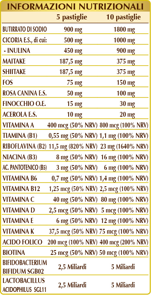 Butirato de sodio, achicoria (Cichorium intybus) raíces E.S. (estandarizado al 90 % en inulina), maitake (Grifola frondosa) esporóforo (hongo) polvo, shiitake (Lentinula edodes) esporóforo (hongo) polvo, FOS (fructooligosacáridos), fermentos lácticos (Bifidobacterium bifidum SGB02 y Lactobacillus acidophilus SGL11), rosal silvestre (Rosa canina) frutos E.S. (estandarizado al 70 % en vitamina C), goma arábiga°, celulosa microcristalina°, dióxido de silicio°°, hinojo (Foeniculum vulgare) frutos A.E., vitamina E de origen vegetal (acetato de D-α-tocoferol), estearato de magnesio de origen vegetal°°, vitamina B2 (riboflavina), acerola (Malpighia glabra) frutos E.S. (estandarizado al 50 % en vitamina C), vitamina B3 (niacina), vitamina B5 (pantotenato de calcio), vitamina A (acetato de retinol), liquen de los renos (Cladonia rangiferina) talo E.S. (estandarizado en vitamina D3 colecalciferol 100 000 UI/g), vitamina B1 (clorhidrato de tiamina), ácido fólico activado (L-metilfolato de calcio), vitamina K1 (filoquinona), biotina, vitamina B12 activada (5-deoxiadenosilcobalamina, metilcobalamina). °Agente de carga °°Antiaglomerante