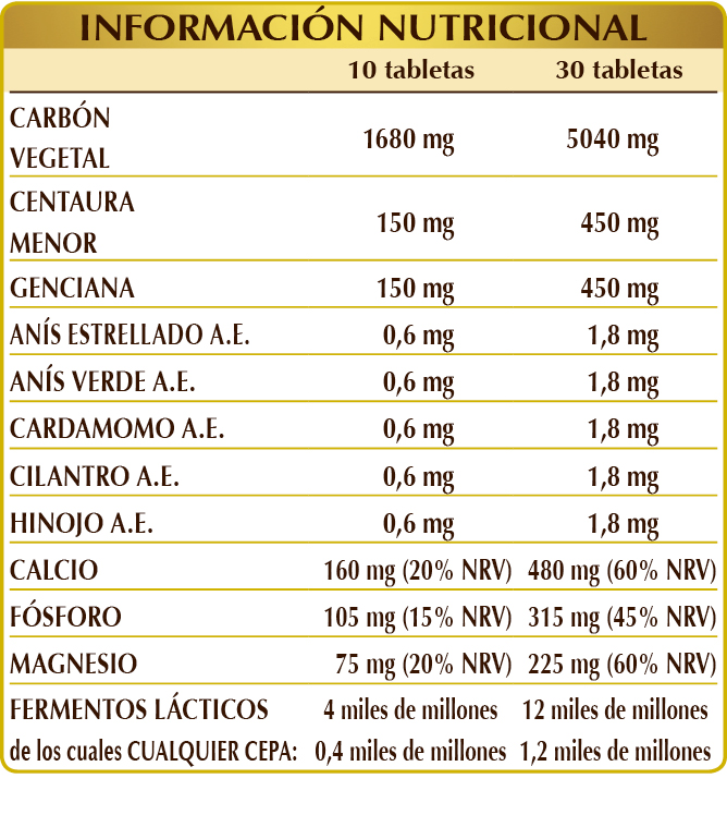 Carbón vegetal puro (Carbo vegetabilis) procedente de madera, celulosa microcristalina°, goma arábiga°, fosfato cálcico dibásico, fosfato cálcico tribásico, hidróxido de magnesio, centaura menor (Centaurium erythraea) sumidades, genciana (Gentiana lutea) raíces, mezcla de fermentos lácticos (titulada al 10 % en cada una de las siguientes cepas ATCC: Bifidobacterium bifidum SD5215, breve SD5206, lactis SD5219; Lactobacillus acidophilus SD5212, brevis SD5214, bulgaricus SD5589, casei SD5213, paracasei SD5275, plantarum SD5209, rhamnosus SD5217), estearato de magnesio de origen vegetal°°, hinojo (Foeniculum vulgare) frutos A.E., anís verde (Pimpinella anisum) frutos A.E., anís estrellado (Illicium verum) frutos A.E., cardamomo (Elettaria cardamomum) frutos A.E., cilantro (Coriandrum sativum) frutos A.E.