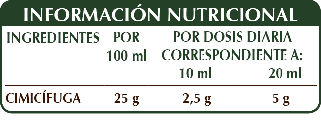 Extracto integral líquido sin alcohol obtenido a partir de: glicerina vegetal bidestilada, agua pura, cimicífuga (Actaea o Cimicifuga racemosa) rizomas.