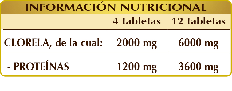 Clorela (Chlorella vulgaris) alga (talo) polvo (60 % de proteínas), maltodextrinas de maíz o arroz, estearato de magnesio de origen vegetal°°, dióxido de silicio°°, goma arábiga°, celulosa microcristalina°.