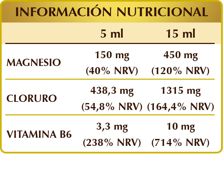 Agua, glicerina, cloruro de magnesio hexahidratado; edulcorantes de origen natural: eritritol, glucósidos de esteviol (estevia), taumatina; vitamina B6 activada (piridoxal 5-fosfato).