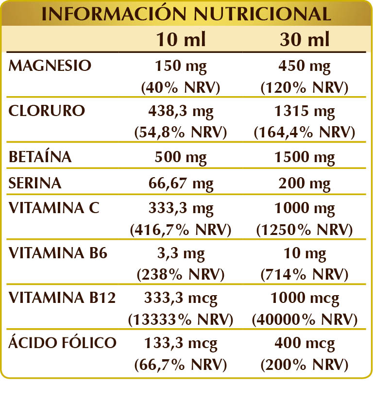 Glicerina vegetal bidestilada, agua pura, betaina base, extracto seco integral de frutos de rosa canina (Rosa canina) que contiene el fitocomplejo completo (titulado al 50% en vitamina C), cloruro de magnesio hexahidratado; edulcorantes de origen natural: eritritol, glicósidos de esteviol de la stevia, taumatina; (L-)serina, vitamina B6 activada (piridoxal 5-fosfato), vitamina B12 activada (5-desoxiadenosilcobalamina, metilcobalamina), ácido fólico activado (L-metilfolato de calcio).