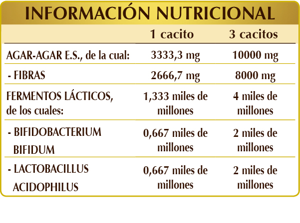 El agar-agar es una fibra soluble que no es digerida ni absorbida por el intestino; promueve la regularidad del tránsito intestinal y normaliza el volumen y la consistencia de las heces. Los fermentos lácticos probióticos pueden resultar útiles para reequilibrar la flora bacteriana intestinal natural.