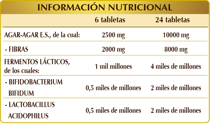 El agar-agar es una fibra soluble que no es digerida ni absorbida por el intestino; promueve la regularidad del tránsito intestinal y normaliza el volumen y la consistencia de las heces. Los fermentos lácticos probióticos pueden resultar útiles para reequilibrar la flora bacteriana intestinal natural.