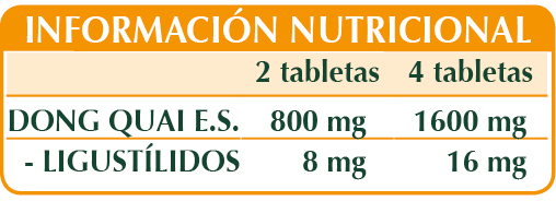 Dong quai (Angelica sinensis) raíces E.S. (titulado al 1 % en ligustílidos), celulosa microcristalina°, goma arábiga°, dióxido de silicio°°, maltodextrinas de maíz o arroz, estearato de magnesio de origen vegetal°°.