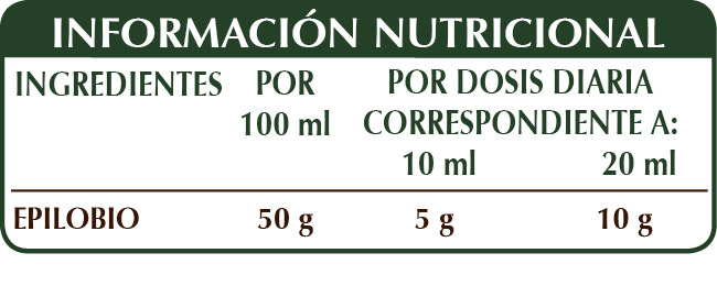 Extracto integral líquido sin alcohol obtenido a partir de: glicerina vegetal bidestilada, agua pura, epilobio (Epilobium parviflorum) hierba.