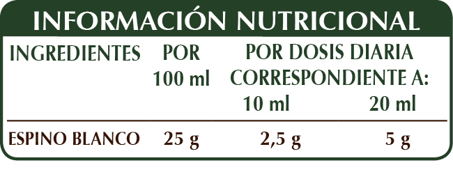 Extracto integral líquido sin alcohol obtenido a partir de: glicerina vegetal bidestilada, agua pura, espino blanco (Crataegus oxyacantha) flores y hojas.