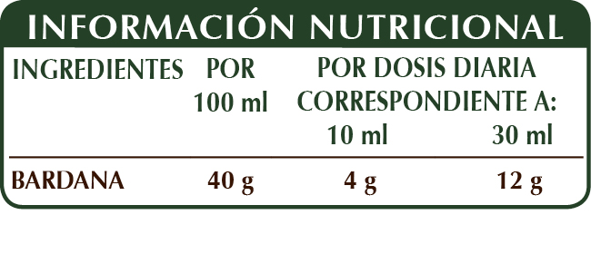Extracto integral líquido sin alcohol obtenido a partir de: glicerina vegetal bidestilada, agua pura, bardana (Arctium lappa) hierba y raíces frescas.