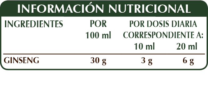 Extracto integral líquido sin alcohol obtenido a partir de: glicerina vegetal bidestilada, agua pura, ginseng (Panax ginseng) raíces.