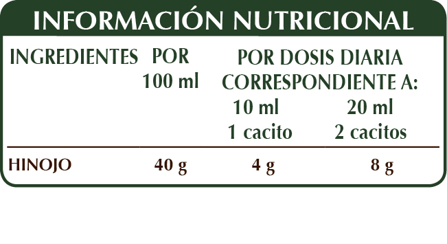 Extracto integral líquido sin alcohol obtenido a partir de: glicerina vegetal bidestilada, agua pura, frutos de hinojo (Foeniculum vulgare).