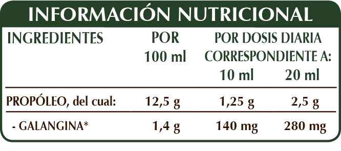 Extracto integral líquido sin alcohol obtenido a partir de: glicerina vegetal bidestilada, agua pura, propóleo (Propolis) resina.