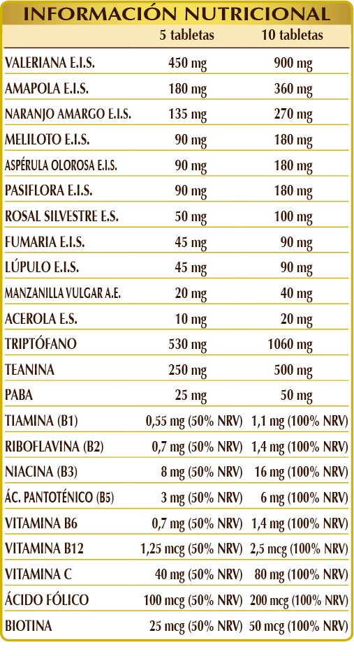 (L-)triptófano, valeriana (Valeriana officinalis) raíces E.I.S., (L-)teanina, amapola (Papaver rhoeas) flores. E.I.S., celulosa microcristalina°, goma arábiga°, naranjo amargo (Citrus aurantium var. amara) hojas y flores E.I.S., meliloto (Melilotus officinalis) hierba con flores E.I.S., pasiflora (Passiflora incarnata) hierba con flores E.I.S., aspérula olorosa (Galium odoratum) hierba con flores E.I.S., rosal silvestre (Rosa canina) frutos E.S. (estandarizado al 70 % en vitamina C), fumaria (Fumaria officinalis) hierba con flores E.I.S., lúpulo (Humulus lupulus) estróbilos (flores hembra) E.I.S., gelatina alimentaria, dióxido de silicio°°, PABA (ácido p-aminobenzoico), manzanilla vulgar (Matricaria chamomilla) cálices (flores) A.E., estearato de magnesio de origen vegetal°°, acerola (Malpighia glabra) frutos E.S. (estandarizado al 50% en vitamina C), vitamina B3 (nicotinamida), vitamina B5 (pantotenato de calcio), sulfato de cobre, vitamina B2 activada (piridoxal5-fosfato), vitamina B6 activada (riboflavina 5-fosfato de sodio), vitamina B1 (clorhidrato de tiamina), ácido fólico activado (L-metilfolato de calcio), biotina, vitamina B12 activada (5-desoxiadenosilcobalamina, metilcobalamina). °Agente de carga. °°Antiaglomerante