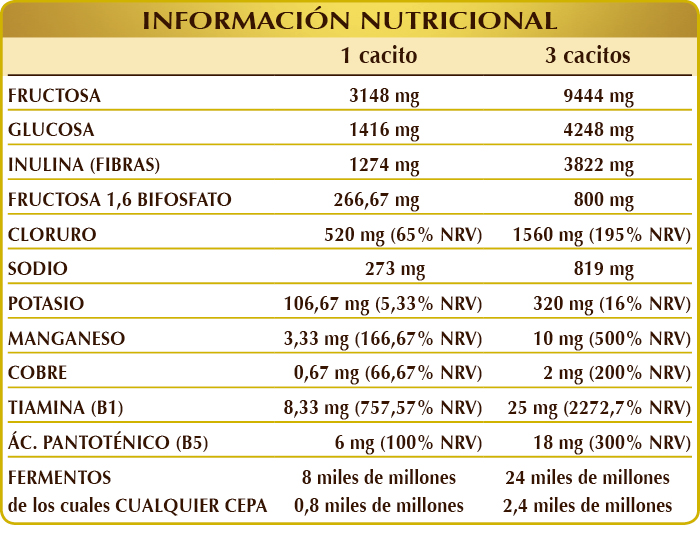 Fructosa, glucosa (dextrosa), achicoria (Cichorium intybus) raíces extracto seco (estandarizado al 90 % en inulina), cloruro de sodio (sal marina), maltodextrinas de maíz o arroz, fructosa 1,6 bifosfato, cloruro de potasio, aroma a caramelo, mezcla de fermentos lácticos (titulada al 10 % en cada una de las siguientes cepas: Bifidobacterium bifidum SD5215, breve SD5206, lactis SD5219; Lactobacillus acidophilus SD5212, brevis SD5214, bulgaricus SD5589, casei SD5213, paracasei SD5275, plantarum SD5209, rhamnosus SD5217), gluconato de manganeso, vitamina B1 (clorhidrato de tiamina), vitamina B5 (pantotenato de calcio), gluconato de cobre.