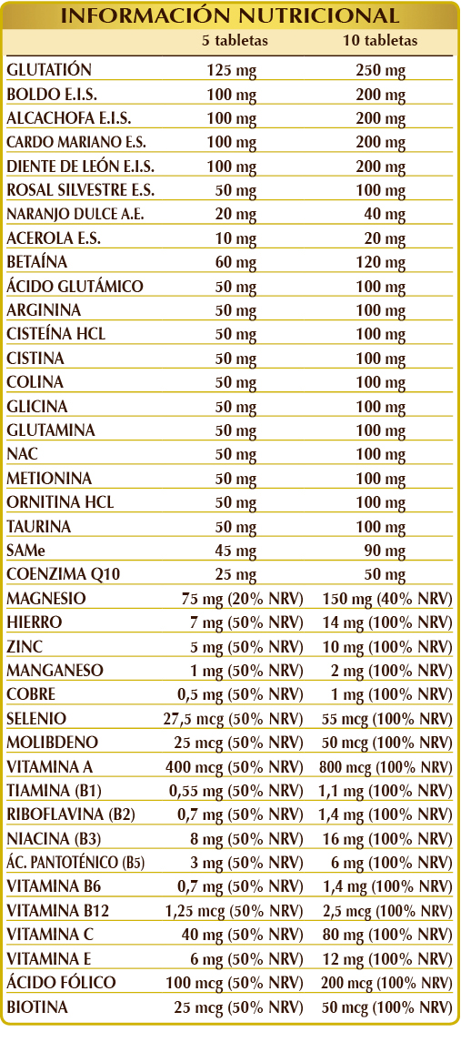 Complemento alimenticio a base de glutatión, hierbas, sales minerales, vitaminas y otros nutrientes. La alcachofa, el cardo mariano y el diente de león favorecen las funciones depurativas del organismo y, junto al boldo y la colina, contribuyen a mantener una correcta función hepática. El zinc, el manganeso, el cobre, el selenio y las vitaminas B2, C y E protegen las células contra el estrés oxidativo.