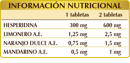 Hesperidina procedente de cítricos, celulosa microcristalina°, goma arábiga°, dióxido de silicio°°, estearato de magnesio de origen vegetal°°, limonero (Citrus limon Burm) cáscaras de los frutos A.E., naranjo dulce (Citrus aurantium var. sinensis o dulcis) cáscaras de los frutos A.E., mandarino (Citrus reticulata) cáscaras de los frutos A.E.