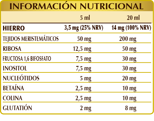 Glicerina vegetal bidestilada, agua pura; macerado glicerinado de tejidos meristemáticos frescos: tamarisco (Tamarix gallica) yemas, carpe blanco (Carpinus betulus) yemas, frambueso (Rubus idaeus) jóvenes brotes, rosal silvestre (Rosa canina) jóvenes brotes; gluconato de hierro, ribosa, fructosa 1,6-bifosfato; corrector de acidez: ácido cítrico; inositol, citrato de betaína, tartrato de colina; mezcla de nucleótidos: AMP (monofosfato de adenosina), CMP (monofosfato de citosina), GMP (monofosfato de guanosina), UMP (monofosfato de uridina); glutatión reducido; edulcorante de origen natural: taumatina. Con edulcorantes de origen natural.