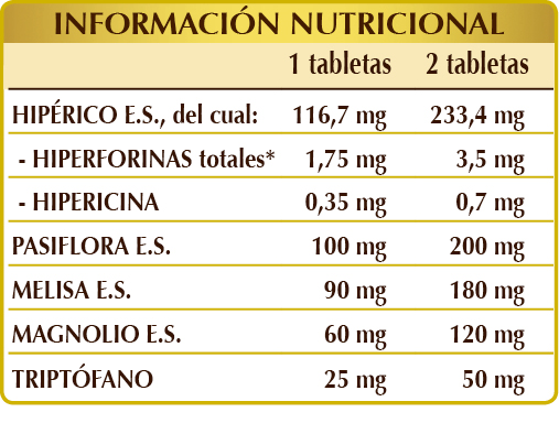 Hipérico (Hypericum perforatum) hierba con flores E.S. (estandarizado al 0,3 % en hipericina, relación hiperforinas/hipericina = 5), pasiflora (Passiflora incarnata) hierba con flores E.S. (estandarizado al 3,5 % en vitexina), melisa (Melissa officinalis) hojas E.S. (estandarizado al 2 % en ácido rosmarínico), magnolio (Magnolia officinalis) cortezas E.S. (estandarizado al 92 % en magnolol + honokiol), celulosa microcristalina°, goma arábiga°, L-triptófano, dióxido de silicio°°, estearato de magnesio de origen vegetal°°.