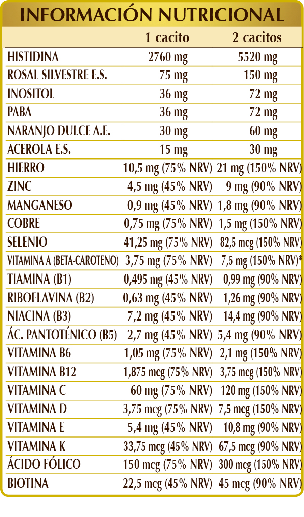 (L-)histidina, maltodextrinas de maíz o arroz, rosal silvestre (Rosa canina) frutos E.S. (estandarizado al 70 % en vitamina C), citrato férrico de amonio, zanahoria (Daucus carota) raíces E.S. (estandarizado al 10 % en beta-caroteno), inositol de origen vegetal (extraído de semillas de maíz), PABA (ácido p-aminobenzoico), gluconato de zinc; aroma natural: naranjo dulce (Citrus aurantium var. sinensis o dulcis) cáscaras de los frutos A.E.; acerola (Malpighia glabra) frutos E.S. (titulado al 50 % en vitamina C), vitamina E (acetato de DL-α-tocoferol); edulcorantes de origen natural: glucósidos de esteviol y taumatina; gluconato de manganeso, vitamina B3 (niacina), sulfato de cobre, vitamina B5 (pantotenato de calcio), vitamina B6 (clorhidrato de piridoxina), vitamina K1 (filoquinina), vitamina B1 (clorhidrato de tiamina), vitamina B2 (riboflavina), ácido fólico, selenito de sodio, biotina, vitamina D3 (colecalciferol), vitamina B12 (cianocobalamina).
