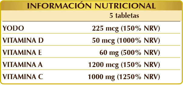 Complemento alimenticio de yodo y vitaminas D, E, A y C. El yodo contribuye a mantener una adecuada función tiroidea, mejora la función cognitiva y, junto a la vitamina C, favorece el buen funcionamiento del sistema nervioso. La vitamina D ayuda a mantener unos niveles de calcio en sangre normales, promueve el bienestar de los huesos y los dientes, interviene en el proceso de división celular, es necesario para una correcta función muscular y, junto a las vitaminas A y C, refuerza el sistema inmunitario. La vitamina A juega un papel importante en el proceso de especialización de las células y ayuda a conservar las membranas mucosas en buen estado. La vitamina C contribuye a la formación del colágeno útil para la buena salud de los vasos sanguíneos, los huesos, los dientes, la piel y los cartílagos; en combinación con la vitamina E, protege las células contra el estrés oxidativo, mientras que, junto al yodo, estimula el metabolismo energético.