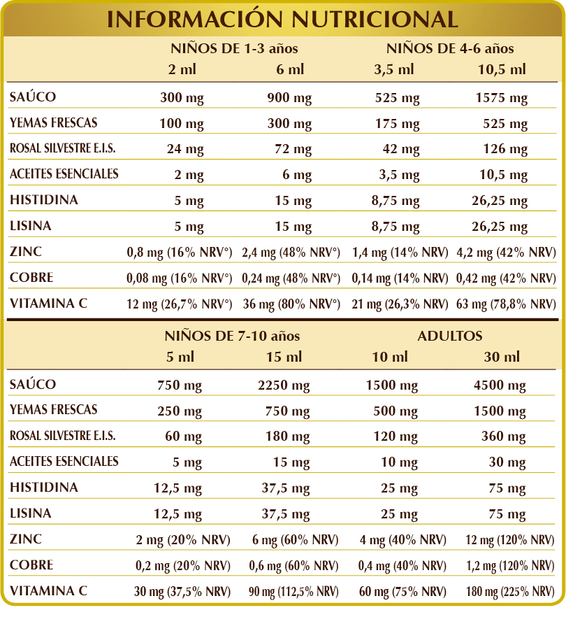 Glicerina vegetal bidestilada, miel mil flores (20 %), saúco (Sambucus nigra) flores E.I.L., agua pura, rosal silvestre (Rosa canina) frutos E.S. (titulado al 50 % en vitamina C), abeto blanco (Abies pectinata) yemas frescas E.I.L., arce campestre (Acer campestris) yemas frescas E.I.L., carpe blanco (Carpinus betulus) yemas frescas E.I.L., cedro del Líbano (Cedrus libani) yemas frescas E.I.L., enebro (Juniperus communis) jóvenes brotes frescos E.I.L., avellano (Corylus avellana) yemas frescas E.I.L., aliso negro (Alnus glutinosa) yemas frescas E.I.L., pino mugo (Pinus montana) yemas frescas E.I.L., grosellero negro (Ribes nigrum) yemas frescas E.I.L., rosal silvestre (Rosa canina) jóvenes brotes frescos E.I.L., gluconato de zinc, (L-)histidina, (L-)lisina; edulcorantes de origen natural: glucósidos de esteviol y taumatina; niaulí (Melaleuca leucadendron var. viridiflora) hojas A.E., eucalipto (Eucalyptus globulus) hojas y ramitas A.E., cayeput (Melaleuca leucadendron var. cajaputi) hojas A.E., pino silvestre (Pinus sylvestris) agujas (hojas) A.E., árbol de té (Melaleuca alternifolia) hojas A.E., gluconato de cobre.
