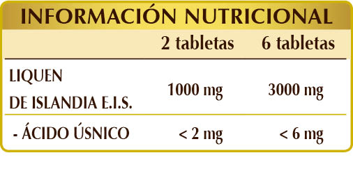 Liquen de Islandia (Cetraria islandica) talo (liquen) E.I.S. (contenido de ácido úsnico < 0,2 %), celulosa microcristalina°, goma arábiga°, dióxido de silicio°°, estearato de magnesio de origen vegetal°°.