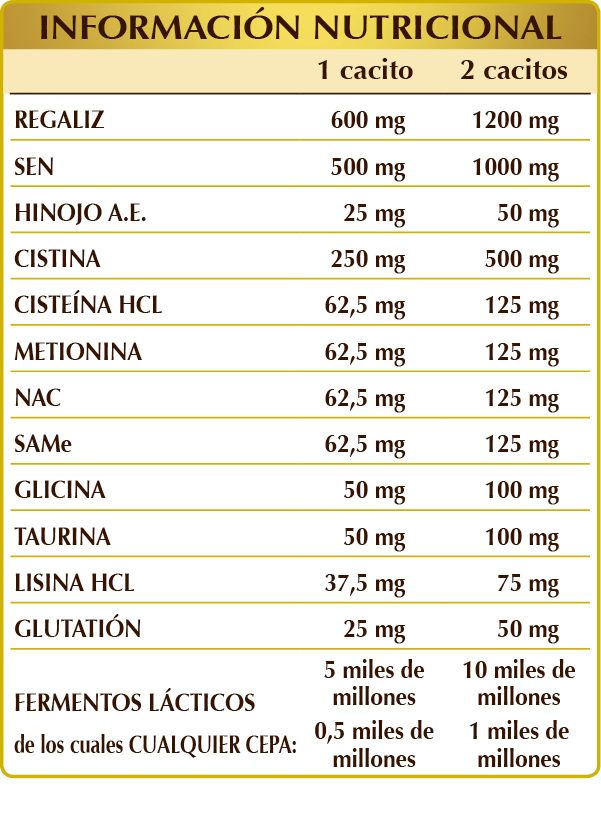 Fructosa, regaliz (Glycyrrhiza glabra) raíces, sen (Cassia angustifolia) hojas, (L-)cistina, (L-)cisteína HCL o clorhidrato, (L-)metionina, NAC (N-acetilcisteína), SAMe (S-adenosil metionina), glicina, taurina, (L-)lisina HCL o clorhidrato, hinojo (Foeniculum vulgare) semillas A.E, glutatión, mezcla de fermentos lácticos (titulada al 10 % en cada una de las siguientes cepas ATCC: Bifidobacterium bifidum SD5215, Bifidobacterium breve SD5206, Bifidobacterium lactis SD5219; Lactobacillus acidophilus SD5212, Lactobacillus brevis SD5214, Lactobacillus bulgaricus SD5589, Lactobacillus casei SD5213, Lactobacillus paracasei SD5275, Lactobacillus plantarum SD5209, Lactobacillus rhamnosus SD5217).