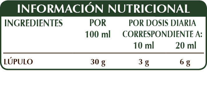 Extracto integral líquido sin alcohol obtenido a partir de: glicerina vegetal bidestilada, agua pura, lúpulo (Humulus lupulus) estróbilos (flores hembra).