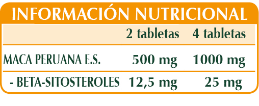 Maca (Lepidium meyenii) raíces E.S. (titulado al 2,5 % en beta-sitosteroles), maltodextrinas de maíz o arroz, celulosa microcristalina°, goma arábiga°, dióxido de silicio°°, estearato de magnesio de origen vegetal°°.