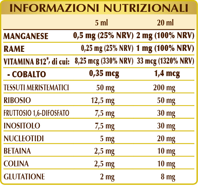 Glicerina vegetal bidestilada, agua pura; macerado glicerinado de tejidos meristemáticos frescos (1 %): castaño (Castanea vesca, sinónimo Castanea sativa) yemas, castaño de Indias (Aesculus hippocastanum) yemas (libres de escina), álamo negro (Populus nigra) yemas; ribosa, fructosa 1,6-bifosfato; corrector de acidez: ácido cítrico; inositol, citrato de betaína, tartrato de colina; mezcla de nucleótidos: AMP (monofosfato de adenosina), CMP (monofosfato de citosina), GMP (monofosfato de guanosina), UMP (monofosfato de uridina); gluconato de manganeso, glutatión reducido, gluconato de cobre; edulcorante de origen natural: taumatina; vitamina B12 (cianocobalamina). Con edulcorantes de origen natural.