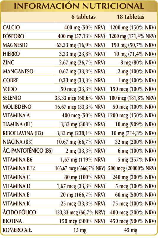 Complemento alimenticio con todas las vitaminas y todos los oligoelementos, especialmente rico en calcio y fósforo. El calcio contribuye a la neurotransmisión normal y con hierro, magnesio, zinc, vitamina B12, D y ácido fólico favorece el proceso normal de división celular. El fósforo promueve el funcionamiento regular de las membranas celulares, mientras que el hierro, el yodo y el zinc favorecen la función cognitiva normal. La vitamina B5 ayuda a mantener unas adecuadas prestaciones mentales, mientras que el magnesio, el yodo, las vitaminas B1, B2, B3, B6, B12, C y la biotina promueven el buen funcionamiento del sistema nervioso. El magnesio, el hierro, las vitaminas B2, B3, B5, B6, B12, C y el ácido fólico contribuyen a reducir el cansancio y la fatiga.