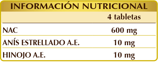 NAC (N-acetilcisteína), celulosa microcristalina°, goma arábiga°, dióxido de silicio°°, anís estrellado (Illicium verum) frutos A.E., hinojo (Foeniculum vulgare) frutos A.E., estearato de magnesio de origen vegetal°°.