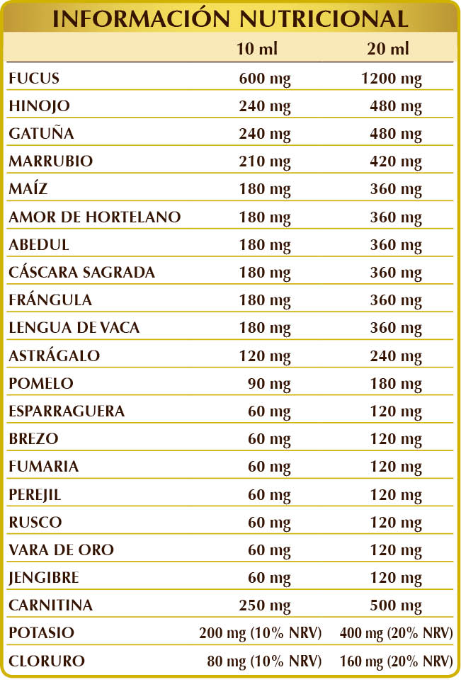 Glicerina vegetal bidestilada, agua pura, fucus o sargazo vejigoso (Fucus vesiculosus) talo (alga) E.I.L., citrato de potasio, (L-)carnitina, hinojo (Foeniculum vulgare) frutos E.I.L., gatuña (Ononis spinosa) raíces E.I.L., marrubio (Marrubium vulgare) hierba con flores E.I.L., maíz (Zea mays) estigmas E.I.L., amor de hortelano (Galium aparine) hierba con flores E.I.L., abedul blanco (Betula alba o pubescens) hojas E.I.L., cáscara sagrada (Rhamnus purshiana) cortezas E.I.L., frángula (Rhamnus frangula) cortezas E.I.L., lengua de vaca (Rumex crispus) raíces E.I.L., cloruro de potasio E.I.L., astrágalo (Astragalus membranaceus) raíces E.I.L., pomelo (Citrus paradisi) semillas E.I.L., esparraguera (Asparagus officinalis) raíces E.I.L., brezo (Calluna vulgaris) hierba con flores E.I.L., fumaria (Fumaria officinalis) hierba con flores E.I.L., perejil (Petroselinum crispum) raíces E.I.L., rusco (Ruscus aculeatus) raíces E.I.L., vara de oro (Solidago virga-aurea) hierba con flores E.I.L., jengibre (Zingiber officinalis) rizomas E.I.L.