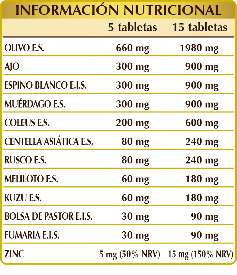 Olivo (Olea europaea) hojas E.S. (titulado al 40 % en oleuropeína), ajo (Allium sativum) bulbos desecados a baja temperatura polvo, espino blanco (Crataegus oxyacantha) flores y hojas E.I.S., muérdago (Viscum album) hojas E.S., coleus (Coleus forskohlii) raíces E.S. (titulado al 10 % en forskolina), goma arábiga°, celulosa microcristalina°, centella asiática (Centella asiatica) hierba E.S. (titulado al 20 % en derivados triterpénicos), rusco (Ruscus aculeatus) raíces E.S. (titulado al 5 % en ruscogenina), meliloto (Melilotus officinalis) hierba con flores E.S. (titulado al 20 % en cumarina), kuzu (Pueraria lobata) raíces E.S. (titulado al 40 % en isoflavonas), gluconato de zinc, bolsa de pastor (Capsella bursa-pastoris) hierba E.I.S., fumaria (Fumaria officinalis) hierba con flores E.I.S., dióxido de silicio°°, estearato de magnesio de origen vegetal°°. °Agente de carga. °°Antiaglomerante.