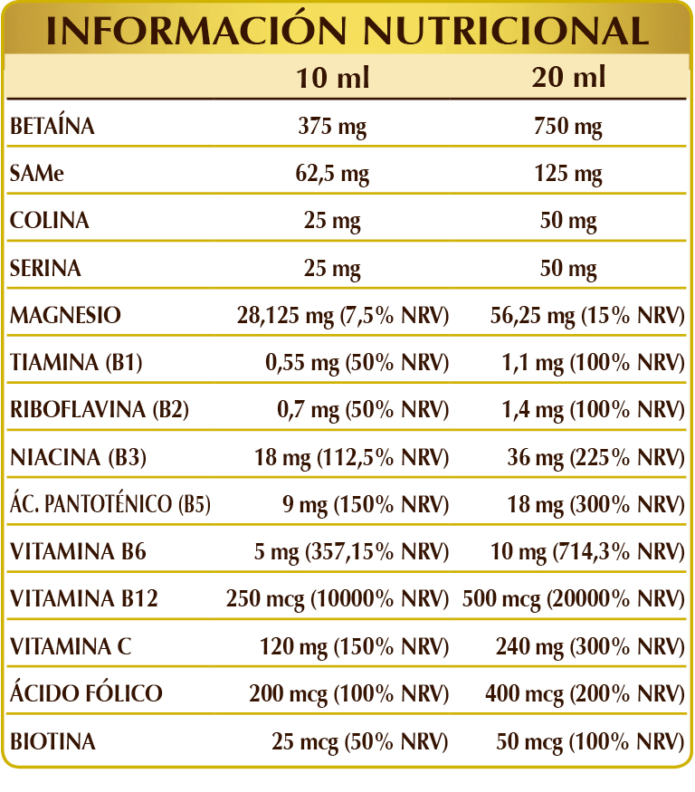 Glicerina vegetal bidestilada, agua pura, betaína, glicerofosfato de magnesio, SAMe (S-adenosil metionina disulfato tosilato), vitamina C (ácido ascórbico), colina tartrato, (L-)serina, vitamina B3 (nicotinamida), vitamina B5 (pantotenato de calcio), vitamina B6 activada (piridoxal-5-fosfato); edulcorantes de origen natural: glucósidos de esteviol de stevia, taumatina; vitamina B2 activada (riboflavina 5-fosfato de sodio), vitamina B1 (clorhidrato de tiamina), ácido fólico activado (L-metilfolato de calcio), biotina, vitamina B12 activada (5-desoxiadenosilcobalamina y metilcobalamina).