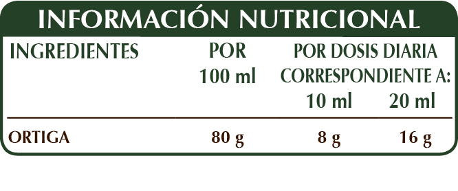 Extracto integral líquido sin alcohol obtenido a partir de: glicerina vegetal bidestilada, agua pura, ortiga (Urtica dioica) hojas y raíces.