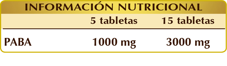 Complemento alimenticio de PABA o ácido para-aminobenzoico, útil si se desea aumentar el aporte de este nutriente en la dieta. El PABA, también conocido como vitamina H1 o B10, es un aminoácido no esencial involucrado en la síntesis del ácido fólico.