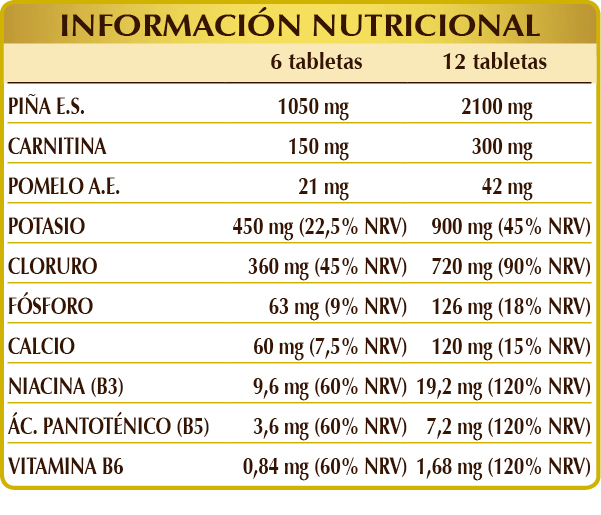 Piña (Ananas comosus) tallos de los frutos E.S. (bromelina 2500 GDU/g), cloruro de potasio, celulosa microcristalina°, goma arábiga°, fosfato cálcico dibásico, (L-)carnitina, fosfato potásico dibásico, citrato de potasio, dióxido de silicio°°, estearato de magnesio de origen vegetal°°, pomelo (Citrus paradisi) cáscaras de los frutos A.E., vitamina B3 (nicotinamida), vitamina B5 (pantotenato de calcio), vitamina B6 (piridoxal-5-fosfat).