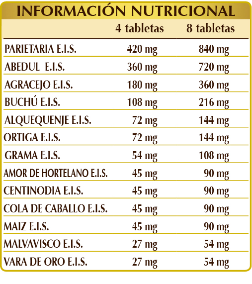 Parietaria (Parietaria officinalis) hierba E.I.S., abedul blanco (Betula alba o pubescens) hojas E.I.S., celulosa microcristalina°, goma arábiga°, dióxido de silicio°°, agracejo (Berberis vulgaris) cortezas de las raíces E.I.S., buchú (Barosma betulina) hojas E.I.S., alquequenje (Physalis alkekengi) frutos E.I.S., ortiga (Urtica dioica) hojas y raíces E.I.S., grama (Agropyron repens) rizomas E.I.S., amor de hortelano (Galium aparine) hierba con flores E.I.S., centinodia (Polygonum aviculare) hierba E.I.S., cola de caballo (Equisetum arvense) hierba E.I.S., maíz (Zea mays) estigmas E.I.S., malvavisco (Althaea officinalis) raíces E.I.S., vara de oro (Solidago virga-aurea) hierba con flores E.I.S., estearato de magnesio de origen vegetal°°.