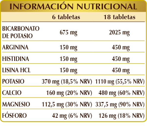 Bicarbonato de potasio, goma arábiga°, celulosa microcristalina°, carbonato cálcico, fosfato potásico dibásico, (L-)arginina, (L-)histidina, (L-)lisina HCL o clorhidrato, óxido de magnesio, carbonato de magnesio, dióxido de silicio°°, estearato de magnesio de origen vegetal°°.