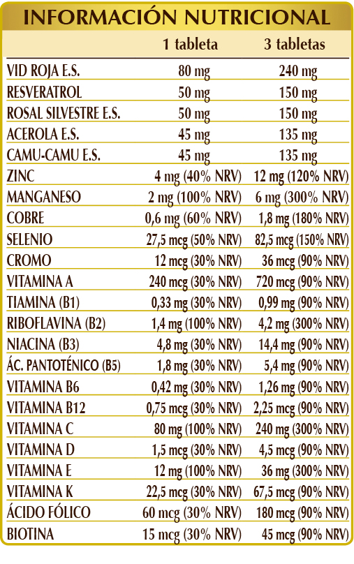 Vid roja (Vitis vinifera) semillas E.S. (titulado al 95 % en proantocianidinas oligoméricas), resveratrol de origen vegetal, rosal silvestre (Rosa canina) frutos E.I.S. (titulado al 70 % en vitamina C), celulosa microcristalina°, goma arábiga°, acerola (Malpighia glabra) frutos E.S. (titulado al 50 % en vitamina C), camu-camu (Myrciaria dubia) frutos E.S. (titulado al 50 % en vitamina C), gluconato de zinc, vitamina E de origen vegetal (acetato de D-α-tocoferol), gluconato de manganeso, dióxido de silicio°°, vitamina B3 (niacina), estearato de magnesio de origen vegetal°°, sulfato de cobre, vitamina B2 activada (riboflavina 5-fosfato de sodio), vitamina B5 (pantotenato de calcio), vitamina A (acetato de retinol), vitamina B6 activada (piridoxal-5-fosfato), liquen de los renos (Cladonia rangiferina) talo E.S. (titulado en vitamina D3 colecalciferol 100 000 UI/g), Vitamina B1 (clorhidrato de tiamina), picolinato de cromo, selenito de sodio, ácido fólico activado (L-metilfolato de calcio), vitamina K1 (filoquinona), biotina, vitamina B12 activada (5-deoxiadenosilcobalamina, metilcobalamina). °Agente de carga. °° Antiaglomerante.
