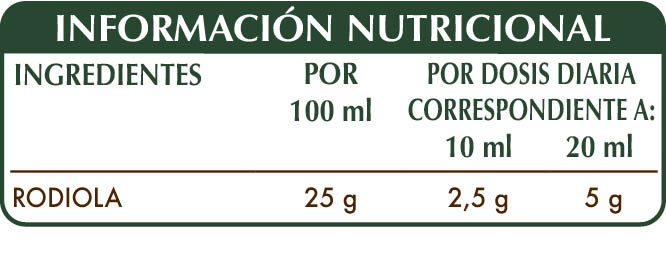 Extracto integral líquido sin alcohol obtenido a partir de: glicerina vegetal bidestilada, agua pura, rodiola (Rhodiola rosea) raíces.