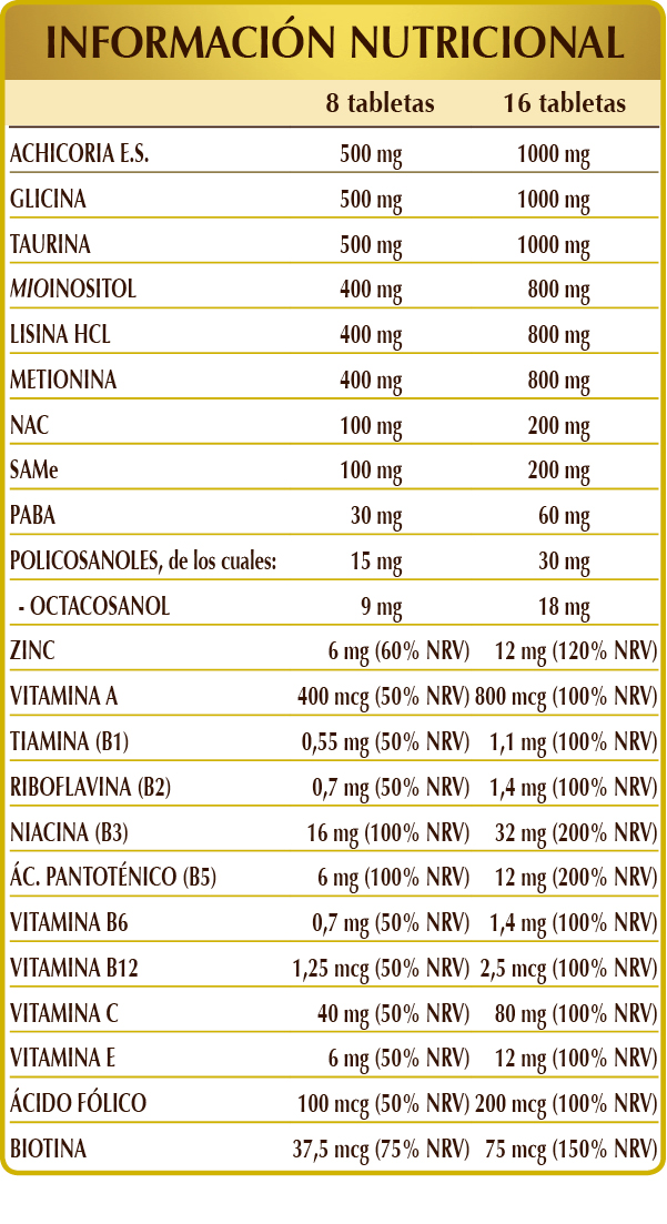 Achicoria (Cichorium intybus) raíces E.S. (titulado al 90 % en inulina), glicina, taurina, mio-inositol de origen vegetal (procedente de semillas de maíz), (L-)lisina HCL o clorhidrato, (L-)metionina, celulosa microcristalina°, goma arábiga°, SAMe (S-adenosil metionina tosilato de disulfato), NAC (N-acetilcisteína), dióxido de silicio°°, gluconato de zinc, vitamina C (ácido ascórbico), PABA (ácido p-aminobenzoico), estearato de magnesio de origen vegetal°°, vitamina B3 (nicotinamida), policosanoles de caña de azúcar (extracto titulado al 60 % en octacosanol), vitamina E de origen vegetal (acetato de D-α-tocoferol), vitamina B5 (pantotenato de calcio), vitamina A (acetato de retinol), vitamina B6 (clorhidrato de piridoxina), vitamina B1 (clorhidrato de tiamina), vitamina B2 (riboflavina), ácido fólico, biotina, vitamina B12 (cianocobalamina). °Agente de carga. °°Antiaglomerante.