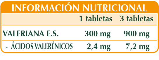Valeriana (Valeriana officinalis) raíces E.S. (estandarizado do al 0,8 % en ácidos valerénicos totales), maltodextrinas de maíz o arroz, celulosa microcristalina°, goma arábiga°, dióxido de silicio°°, estearato de magnesio de origen vegetal°°.