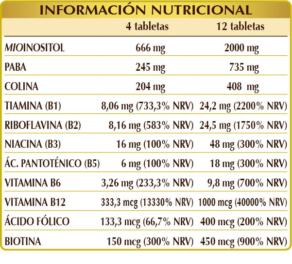 Mio-inositol de origen natural (extraído de semillas de maíz), colina tartrato, PABA (ácido para-aminobenzoico), celulosa microcristalina°, goma arábiga°, fosfato cálcico dibásico°, vitamina B3 (nicotinamida, inositol hexanicotinato), vitamina B2 activada (riboflavina 5-fosfato de sodio), vitamina B1 (clorhidrato de tiamina), dióxido de silicio°°, vitamina B5 (pantotenato de calcio), vitamina B6 activada (piridoxal-5-fosfato), estearato de magnesio de origen vegetal°°; edulcorantes de origen natural: glucósidos de esteviol de stevia, taumatina; vitamina B12 activada (5-desoxiadenosilcobalamina, metilcobalamina), biotina, ácido fólico activado (L-metilfolato cálcico). °Agente de carga °°Antiaglomerante