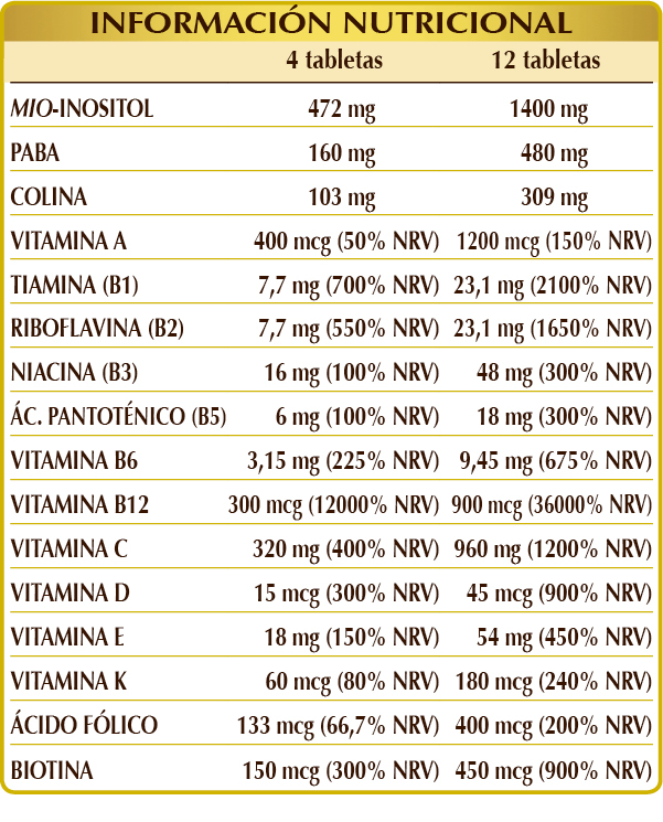 Complemento alimenticio que contiene todas las vitaminas y otras sustancias con efecto nutritivo y fisiológico, como inositol, PABA y colina. Las vitaminas B6 y B12 favorecen la formación normal de los glóbulos rojos y, junto a las vitaminas B2, B3, B5 y C y al ácido fólico, reducen el cansancio y la fatiga. Las vitaminas B1, B3, B6, B12 y C y la biotina contribuyen al correcto funcionamiento del sistema nervioso y, en conjunción con el ácido fólico, son útiles para mantener una correcta función psicológica. El ácido fólico y las vitaminas A, B6, B12, C y D favorecen el buen funcionamiento del sistema inmunitario. La biotina mejora la salud del cabello y, junto a las vitaminas A, B2, B3 y C, ayuda a conservar el bienestar de la piel. Las vitaminas D y K contribuyen a mantener los huesos sanos, mientras que las vitaminas A y B2 son necesarias para conservar la capacidad visual. Finalmente, las vitaminas B2, C y E protegen a las células del estrés oxidativo. Además, la colina contribuye al metabolismo normal de la homocisteína y de los lípidos y apoya la función hepática normal.