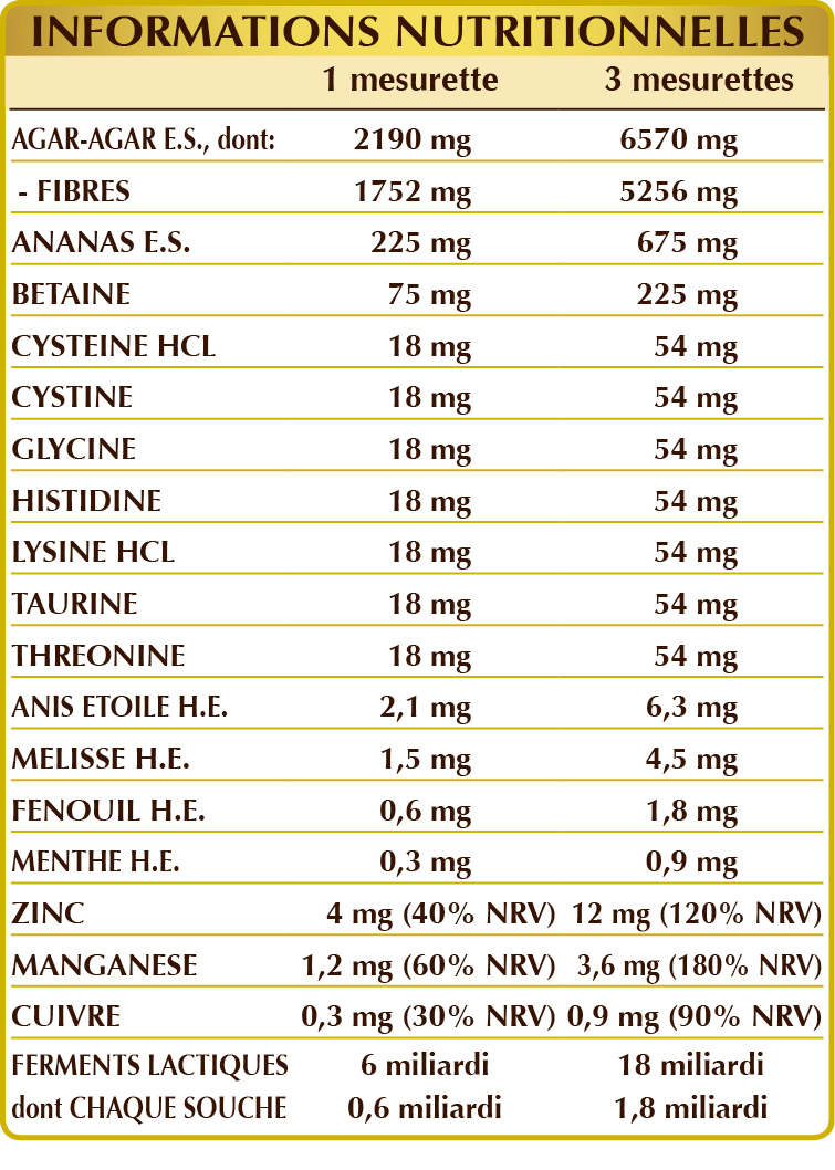 Agar-agar (Gelidium amansii) thalle (algue), maltodextrine de maïs ou de riz, ananas (Ananas comosus) tiges des fruits E.S. (broméline 2500 GDU/g), HCL chlorhydrate de bétaïne ou chlorhydrate, mélange de ferments lactiques vivants (normalisé à 10% pour chacune des souches suivantes: Bifidobacterium bifidum SD5215, breve SD5206, lactis SD5219; Lactobacillus acidophilus SD5212, brevis SD5214, bulgaricus SD5589, casei SD5213, paracasei SD5275, plantarum SD5209, rhamnosus SD5217), gluconate de zinc, (L-)cystéine HCL ou chlorhydrate, (L-)cystine, glycine, (L-)histidine, (L-)lysine HCL ou chlorhydrate, taurine, (L-)thréonine, gluconate de manganèse, gluconate de cuivre, anis étoilé (Illicium verum) fruits H.E., mélisse (Melissa officinalis) feuilles H.E., édulcorants d'origine naturelle: glycosides de steviol et thaumatine ; fenouil (Foeniculum vulgare) fruits H.E., menthe poivrée (Mentha piperita) feuilles H.E.