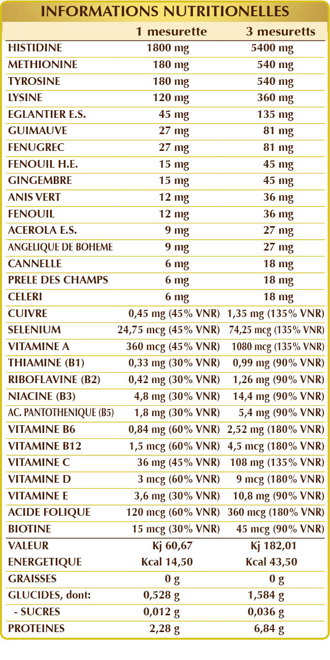 (L-)histidine, maltodextrine de maïs ou de riz, (L-)méthionine, (L-)tyrosine, (L-)lysine, églantier (Rosa canina) fruits E.S. (standardisé à 70% en vitamine C), guimauve officinale (Althaea officinalis) racines Pulv, fenugrec (Trigonella foenum-graecum) graines Pulv, fenouil (Foeniculum vulgare) fruits H.E, aneth (Anethum graveolens) fruits Pulv, anis vert (Pimpinella anisum) fruits Pulv, fenouil (Foeniculum vulgare) fruits Pulv, gingembre (Zingiber officinalis) rhizomes Pulv, acérola (Malpighia glabra) fruits E.S. (standardisé à 50% en vitamine C), vitamine E végétale (acétate de D-α-tocophéryle) ; édulcorants naturels : glycosides de stéviol de stévia, thaumatine ; racines d'angélique de Bohême (Angelica archangelica) Pulv., écorce de cannelle (Cinnamomum zeylanicum) Pulv., herbe de prêle (Equisetum arvense) Pulv., vitamine B3 (nicotinamide), vitamine A (acétate de rétinyle), sulfate de cuivre, vitamine B5 (pantothénate de calcium), vitamine B6 activée (pyridoxal-5-phosphate), vitamine D3 (cholécalciférol 100 000 UI/g), vitamine B2 activée (riboflavine 5-phosphate de sodium), vitamine B1 (chlorhydrate de thiamine), acide folique activé (L-méthylfolate de calcium), sélénite de sodium, biotine, vitamine B12 activée (5-désoxyadénosylcobalamine, méthylcobalamine). Pulv. = Poudre Édulcoré uniquement avec des édulcorants d'origine naturelle.