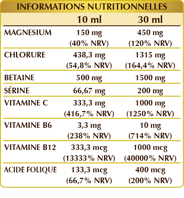 10 ml contiennent en moyenne: 1,26 g de chlorure de magnésium hexahydraté qui correspond à 150 mg (40% VNR) de magnésium.