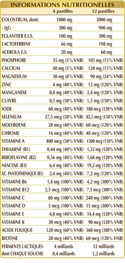 Colostrum bovin (normalisé à 30% en immunoglobulines IgG), cellulose microcristalline°, gomme arabique°, phosphate de calcium dibasique, églantier (Rosa canina) fruits E.S. (standardisé à 70% de vitamine C), lactoferrine bovine, gluconate de fer, glycérophosphate de magnésium, oxyde de magnésium, dioxyde de silicium°°, gluconate de zinc, acérola (Malpighia glabra) fruits E.S. (standardisé à 50% de vitamine C), mélange de ferments lactiques (standardisé à 10% dans chacune des souches suivantes: Bifidobacterium bifidum SD5215, breve SD5206, lactis SD5219; Lactobacillus acidophilus SD5212, brevis SD5214, bulgaricus SD5589, casei SD5213, paracasei SD5275, plantarum SD5209, rhamnosus SD5217), vitamine E d'origine végétale (acétate de D-α-tocophéryle), stéarate de magnésium d'origine végétale°°, gluconate de manganèse, vitamine B3 (nicotinamide), vitamine A (acétate de rétinyle), vitamine B5 (pantothénate de calcium), vitamine B6 activée (pyridoxal-5-phosphate), lichen (Cladonia rangiferina) thalle E.S. (standardisé en vitamine D3 cholécalciférol 100 000 UI/g), sulfate de cuivre, vitamine vitamine B2 activée (riboflavine 5-phosphate de sodium), vitamine B1 (chlorhydrate de thiamine), acide folique activé (L-méthylfolate de calcium), sélénite de sodium, vitamine K1 (phylloquinone), biotine, vitamine B12 activée (5-désoxyadénosylcobalamine, méthylcobalamine). E.S. = Extrait Sec °Agent de charge. °°Antiagglomerante.