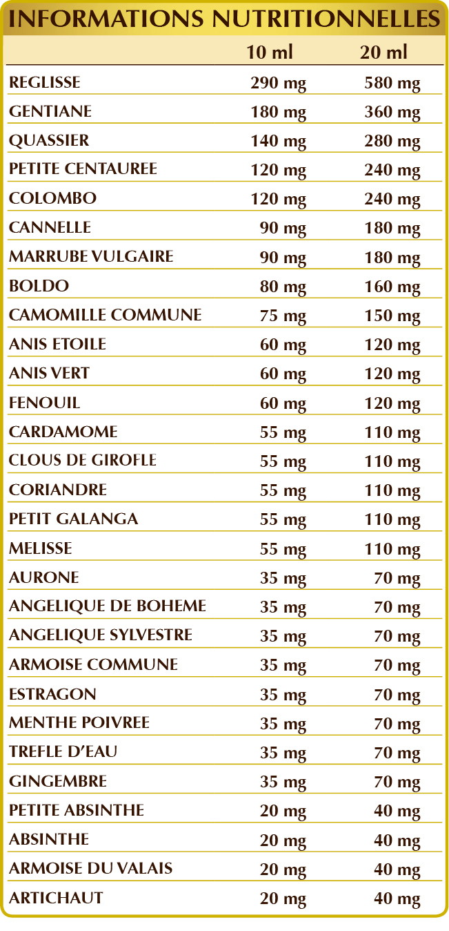 Eau pure, alcool éthylique (Alcoolvis®= Alcool purifié selon la méthode inventée par le Dr Martino Giorgini), réglisse (Glycyrrhiza glabra) racines E.I.L., gentiane (Gentiana lutea) racines E.I.L., quassier (Quassia amara) bois E.I.L., petite centaurée (Centaurium erythraea) sommités E.I.L., colombo (Jateorhiza palmata) racines E.I.L., cannelle (Cinnamomum zeylanicum) écorces E.I.L., marrube blanc (Marrubium vulgare) herbe avec des fleurs E.I.L., boldo (Peumus boldus) feuilles E.I.L., camomille matricaire (Matricaria chamomilla) têtes des fleurs E.I.L., anis étoilé (Illicium verum) fruit E.I.L., anis vert (Pimpinella anisum) fruits E.I.L., fenouil (Foeniculum vulgare) fruits E.I.L., cardamome (Elettaria cardamomum) graines E.I.L, clous de girofle (Eugenia caryophyllata) bourgeons floraux E.I.L., coriandre (Coriandrum sativum) fruits E.I.L., petit galanga (Alpinia officinarum) rhizomes E.I.L., mélisse (Melissa officinalis) feuilles E.I.L., aurone (Artemisia abrotanum) sommités E.I.L., angélique de Bohême (Angelica archangelica) racines E.I.L., angélique sylvestre (Angelica sylvestris) racines E.I.L., armoise commune (Artemisia vulgaris) herbe avec des fleurs E.I.L., estragon (Artemisia dracunculus) feuilles E.I.L., menthe poivrée (Mentha piperita) feuilles E.I.L., trèfle d'eau (Menyanthes trifoliata) feuilles E.I.L., gingembre (Zingiber officinalis) rhizomes E.I.L., petite absinthe (Artemisia pontica) herbe avec des fleurs E.I.L., absinthe (Artemisia absinthium) herbe avec des fleurs E.I.L., armoise du valais (Artemisia vallesiaca) herbe avec des fleurs E.I.L., artichaut (Cynara scolymus) feuilles E.I.L.